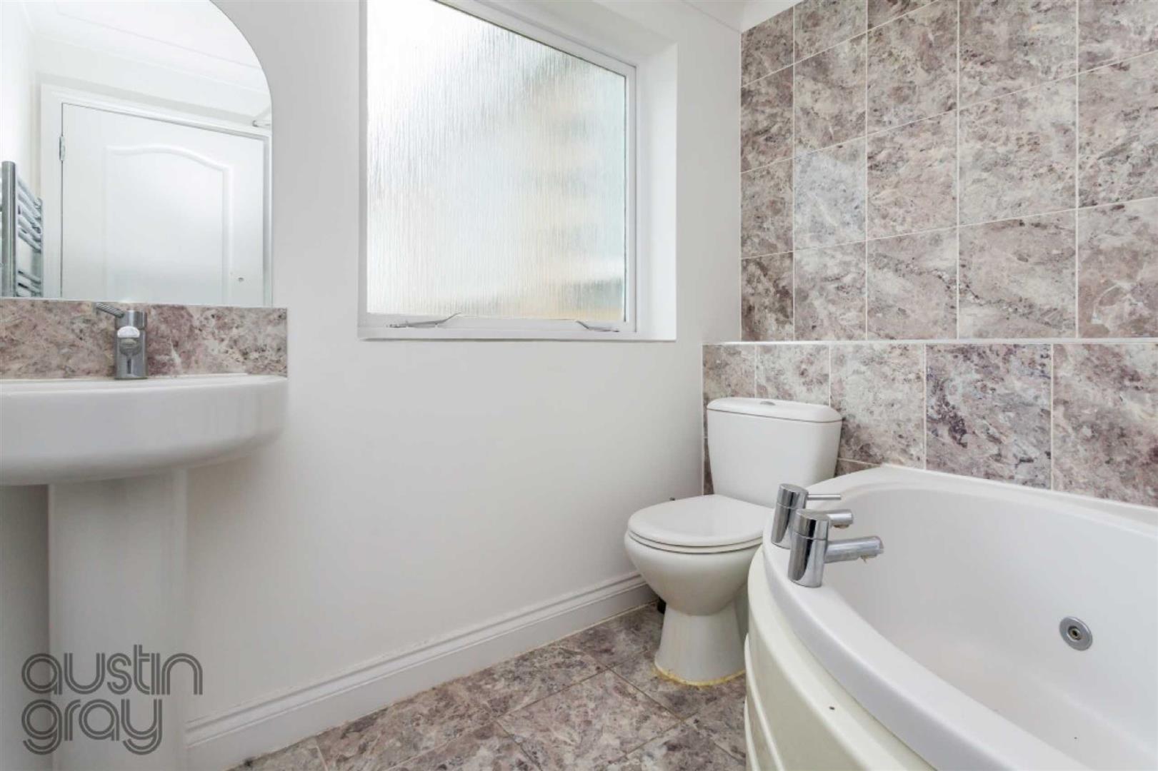 Bathroom/WC with a white suite comprising off a Jacuzzi bath with shower above, low-level WC, pedestal wash basin, tiled floor, towel radiator and window to the side.