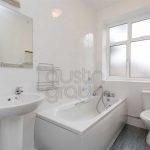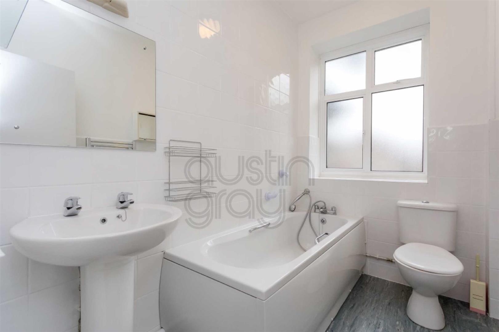 There is a white bathroom suite with a panelled bath, WC and pedestal wash basin, electric towel rail and double glazed window to the side.