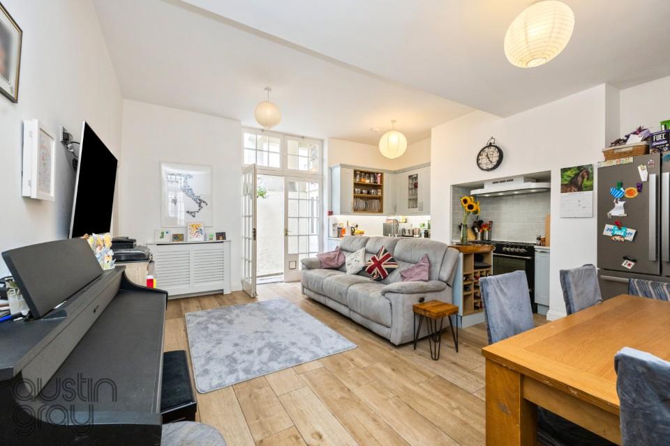 Set within the prestigious Adelaide Crescent, this beautifully presented lower ground floor apartment offers a rare opportunity to enjoy coastal living in one of Hove’s most desirable addresses. Just moments from the seafront and benefitting from a shared courtyard patio garden, this home perfectly combines elegance, versatility, and convenience.Upon entering, a spacious 21-ft entrance hall creates a warm and inviting first impression. The heart of the property is the impressive open-plan living, kitchen, and dining area, measuring 18 ft x 16 ft, an ideal space for entertaining or simply relaxing at home. Alongside two well-proportioned double bedrooms and a third smaller bedroom currently being used as an office. The apartment features a stylish shower room with separate bath, shower, sink and W.C.