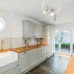 The well fitted kitchen has solid oak working surfaces with a comprehensive range of cupboards and drawer storage both above and below. A butler sink has a porthole window above and a full-length glazed door with windows to either side overlooks and leads out to the walled patio rear garden with raised beds and mature shrubs. There is an integrated fridge and freezer, washing machine, dishwasher along with a five ring gas range. Fired Earth tiles are on two walls with a tiled floor and shelved pantry. A cupboard in the kitchen houses the combination boiler which supplies the domestic hot water and central heating.
