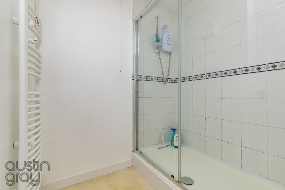 A path leads around the side of the building to the communal entrance hall with the front door opening into an entrance hall with a telephone intercom system and electric radiator. There is a useful utility cupboard with space and plumbing for washing machine and window to the side. The bedroom has UPVC double glazed window and Plantation shutters and electric radiator. The open plan kitchen/living room is comprehensively fitted with double glazed windows to the side and electric radiator in the sitting room. The shower room/WC has a white suite with electric shower and towel rail and window.