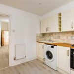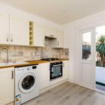 At the rear of the flat is the kitchen with newly fitted units, oak work surface with cupboards both above and below, single drainer sink, four ring gas hob with oven below and extractor hood above, new Worcester combination boiler, radiator, pair of French doors provide access to steps down to a walled and Astro turfed garden.