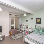 The main studio room has a full length glazed door and window to one side which overlooks and leads out to the shared patio, while on the opposite side of the room is a large window and light well, night storage heater.