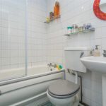 Bathroom/WC has a white suite with enclosed panelled bath with an electric shower over, glass shower screen, wash hand basin, low-level WC, extractor fan and mosaic tiled walls.