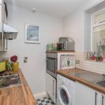 The kitchen has a range of modern white high gloss units and work surfaces to two walls that provide cupboard storage both above and below. A stainless steel single sink overlooks the shared patio on one side, and in addition there is a four ring hob, extractor hood above, electric oven, space and plumbing for washing machine and standing space for a fridge/freezer. Partially tiled walls.