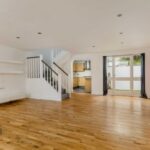 The front door opens into the entrance vestibule with a radiator and a window to the front. A further door opens into a bright and spacious dual aspect open plan living room with window to the front and glazed door with windows either side which leads out to the rear patio. There is a wealth of fitted storage and shelving, down lighters and wooden floor.