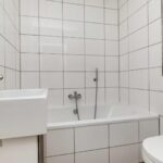 The family bathroom has a modern white suite with a double ended bath with shower attachment, WC, wash basin, towel rail, fitted mirror with a discreet cupboard behind, downlighters.
