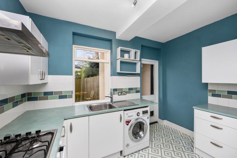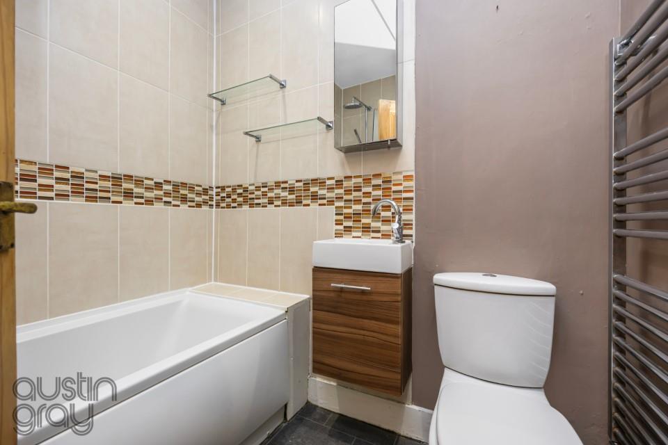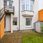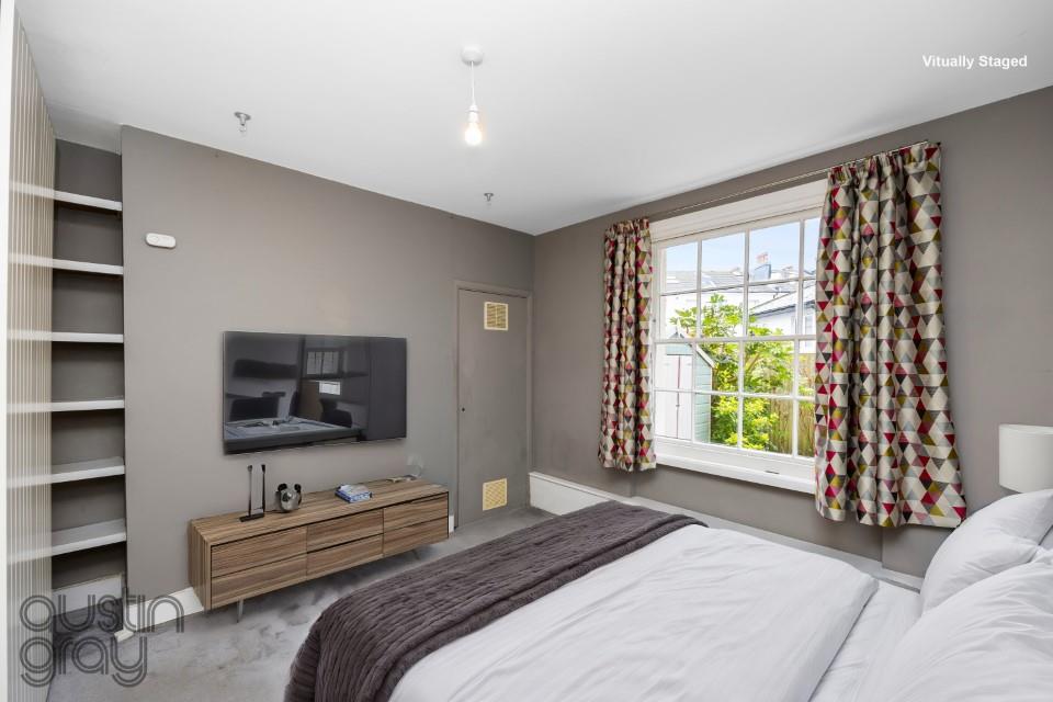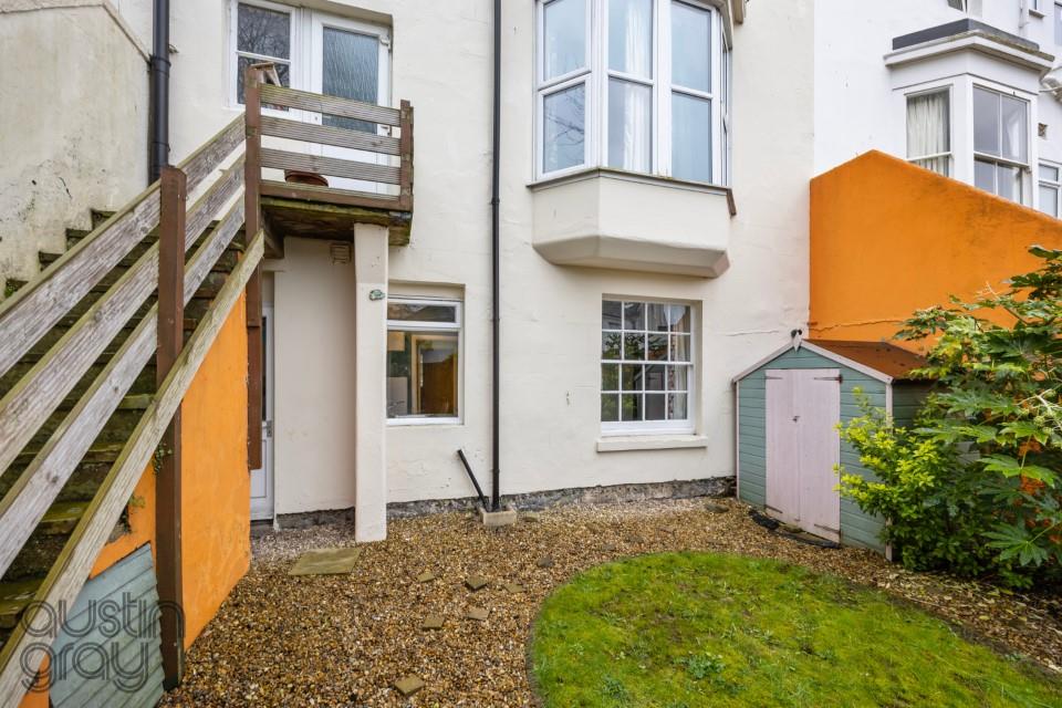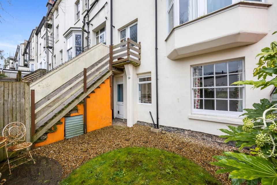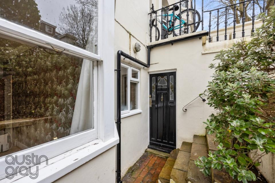 Steps lead down to the flats front door which opens into the entrance vestibule which in turn leads to the hallway. The modern bathroom/WC has a shower above the bath. The smaller of the bedrooms is at the front next to the living room with sash windows to the front and wooden floor. The main bedroom is at the rear overlooking the patio garden. The kitchen is fully fitted with ample cupboard and drawer storage and has access out to the pretty patio garden. There is a small lawn and a paved area perfect for al fresco dining in the warmer months.