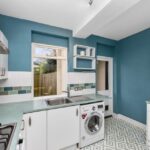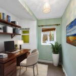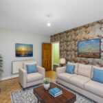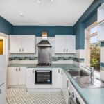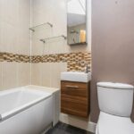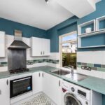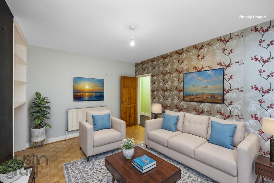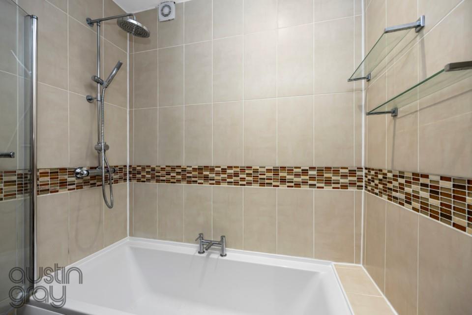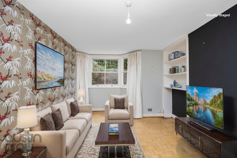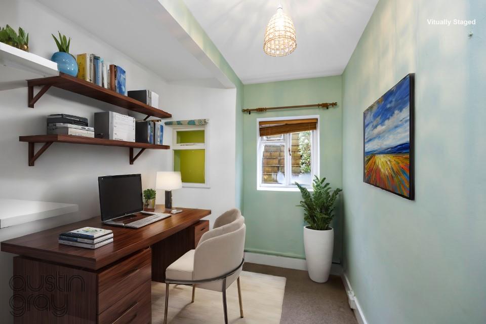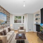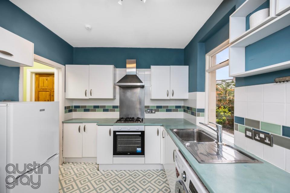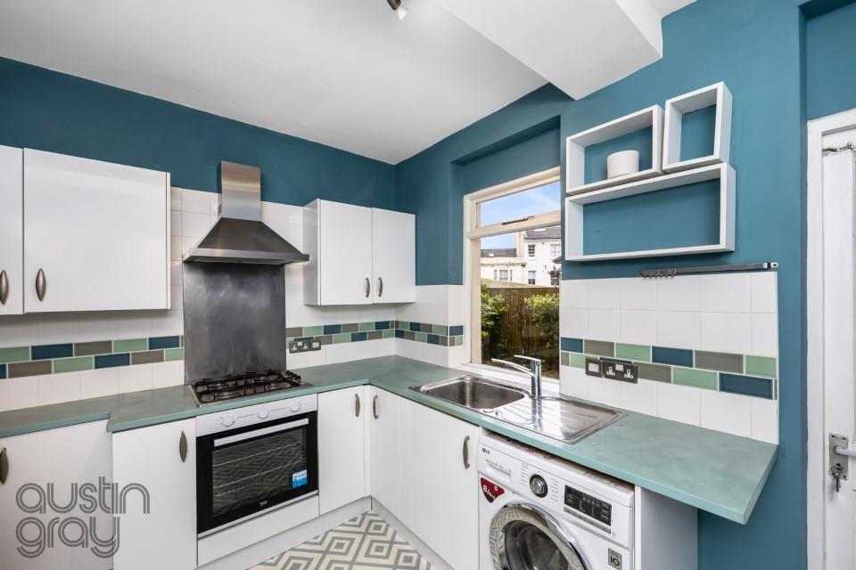Steps lead down to the flats front door which opens into the entrance vestibule which in turn leads to the hallway. The modern bathroom/WC has a shower above the bath. The smaller of the bedrooms is at the front next to the living room with sash windows to the front and wooden floor. The main bedroom is at the rear overlooking the patio garden. The kitchen is fully fitted with ample cupboard and drawer storage and has access out to the pretty patio garden. There is a small lawn and a paved area perfect for al fresco dining in the warmer months.