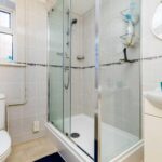 Shower/WC has a corner shower cubicle and vanity unit and tiled walls, radiator, double glazed window to the side.