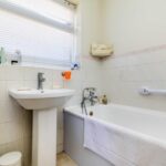 Bathroom/WC has a white suite with bath, pedestal wash basin, WC, and towel radiator.