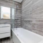Enclosed bath and thermostatically controlled shower, glass shower screen, WC, wash basin with storage, electric towel rail, tiled walls, Velux windows.