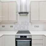 Pocket doors provide access into a brand-new fitted kitchen with a range of cupboards and drawers and integrated appliances including oven and extractor hood, fridge/freezer and concealed washing machine.