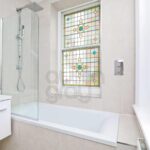 At the rear of the flat is the newly installed bathroom with a fitted shower and glass screen, two feature stained glass leaded light windows and combination boiler.