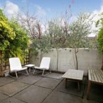 Accessed via French doors, this secluded area is fully walled with flower beds with olive trees and trellis.