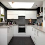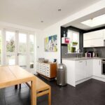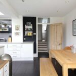 Larger than average room has slate tiled floor, space for large table and chairs. Kitchen is arranged to three walls and has modern white units with Corian work surfaces, glass splash backs, integral appliances including dishwasher and washer/dryer, stainless sink and drainer , window overlooking the patio garden, additional shelved and drawer storage, NEFF four ring induction hob and oven below, Velux window above providing natural light, radiator and larder cupboard.