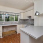 Kitchen in need of some updating has a current range of basic units providing cupboard and drawer storage, appliance standing space, double glazed window overlooking the south facing rear garden, door to side and cupboard housing boiler.