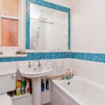 White suite comprising of enclosed bath, electric shower, wash basin, WC, radiator, sash windows to the side, tiled walls.