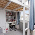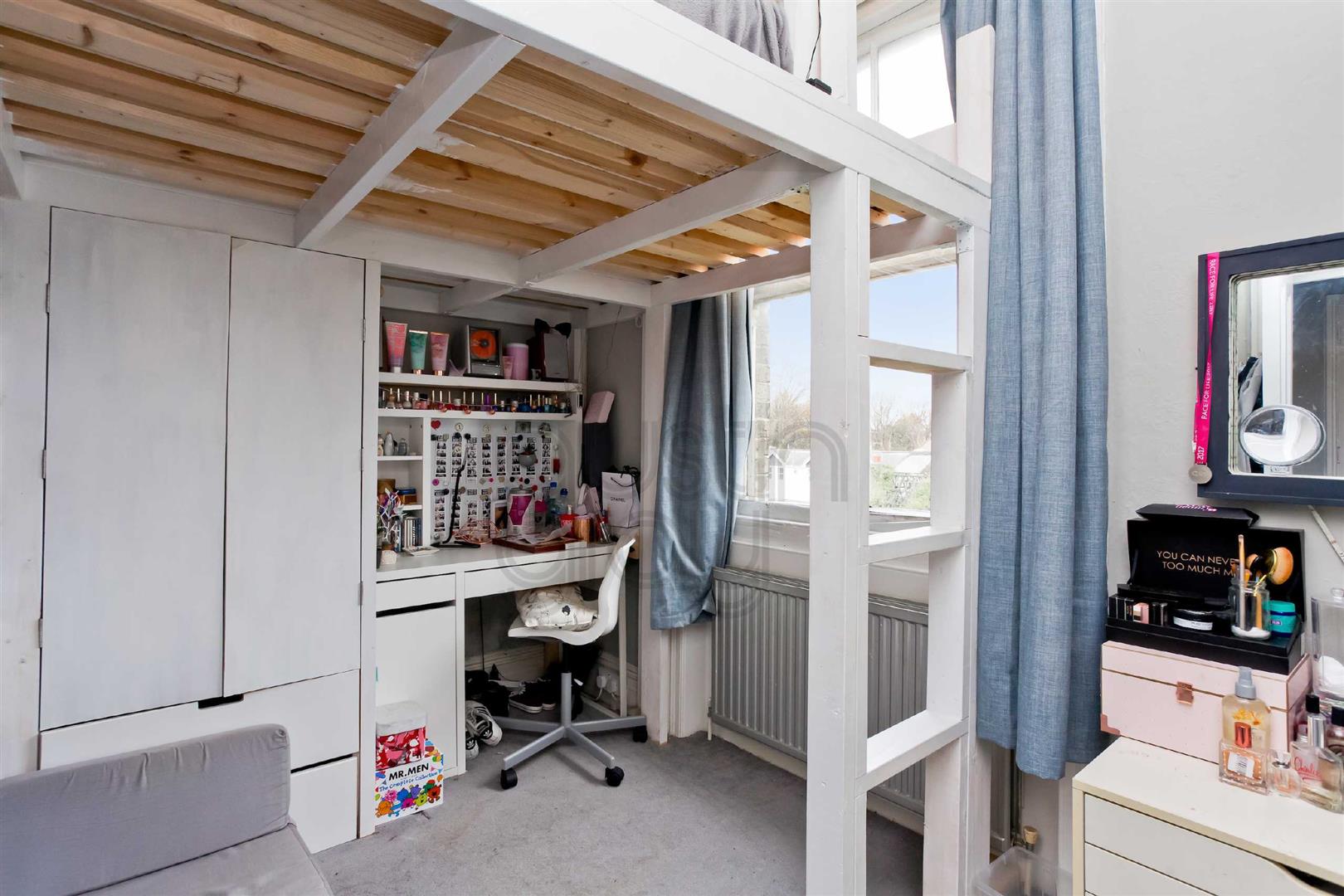 Sash window to the rear with radiator beneath, fitted cabin bed with workstation and storage beneath.