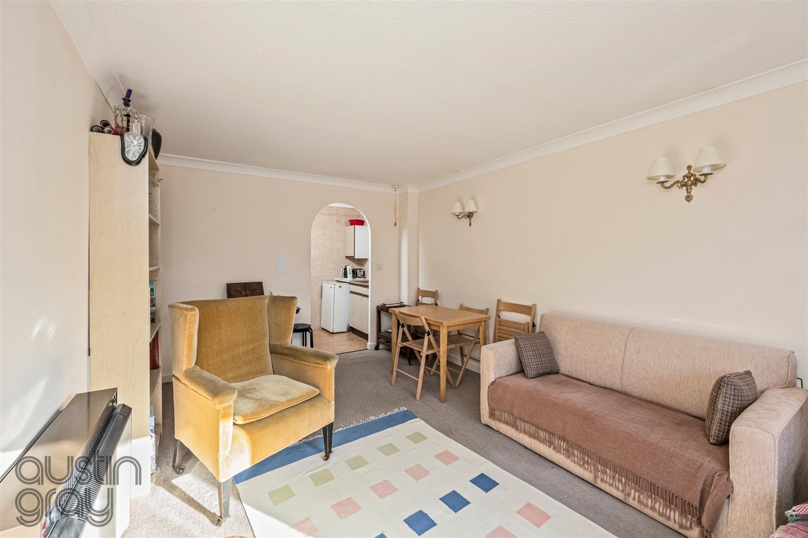The apartment is situated on the first floor and enjoys a pleasant south-westerly aspect overlooking the communal gardens. Access is provided via both a passenger lift and stairwell. The accommodation comprises an entrance hall with a generous storage cupboard, a double bedroom with built-in wardrobes, a bright lounge leading through to the kitchen, and a bathroom with WC.