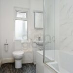 Enclosed shower cubicle with electric fitted shower, low-level WC, washbasin with storage.