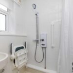 There is a cloakroom and wet room with fitted electric shower, wash basin, towel rail and double glazed window to the side, fully tiled walls.