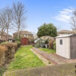 To the front is a walled garden with access leading round to the rear garden that has a paved patio leading to a lawned garden with garden sheds and greenhouse.