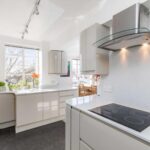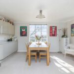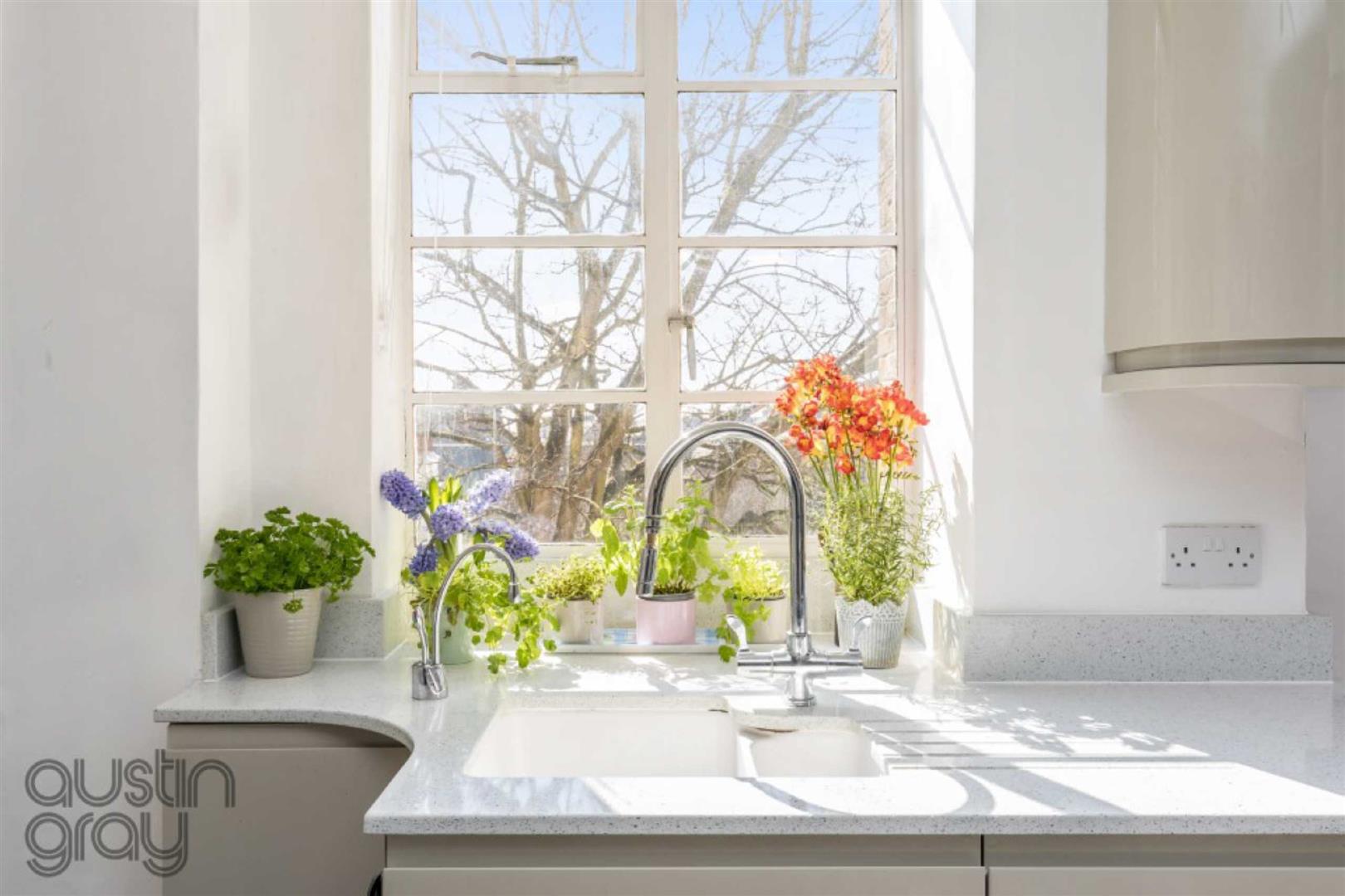 1 ½ bowl sink with water softener, integrated dishwasher, four ring induction hob with extractor hood above, electric fan assisted oven and microwave above. Standing space for fridge/freezer, additional storage and open shelving and window enjoying south-westerly aspect of rooftops towards the sea. A glazed door opens out onto a stairwell.