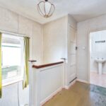 Through a porch the front door opens into the entrance hall and the through living/dining room has sliding patio doors out to the garden. The kitchen overlooks the rear garden and has a range of basic units and a double-glazed door out to the driveway. On the first floor are three bedrooms, family bathroom/WC and separate WC. At the front, the garden is mainly laid to lawn and the long private driveway leads to the single garage. The rear garden has a patio, and the main garden is laid to lawn flanked by mature flower and shrub borders.