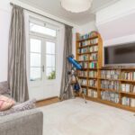 Behind is a second reception room with a stripped and polished wooden floor and radiator. A pair of double glazed French doors lead out into the rear garden.