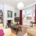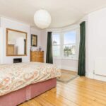 At the front is a spacious double bedroom with a stripped and polished wooden floor, sash bay window, radiator, fireplace and fitted storage.