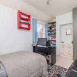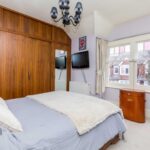 Main bedroom has sash windows to the front with attractive further coloured stained glass window above, built-in wardrobes to one wall, radiator.