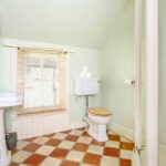 Low level WC wash hand basin, tiled splash backs, tiled splash back, painted wooden floor.