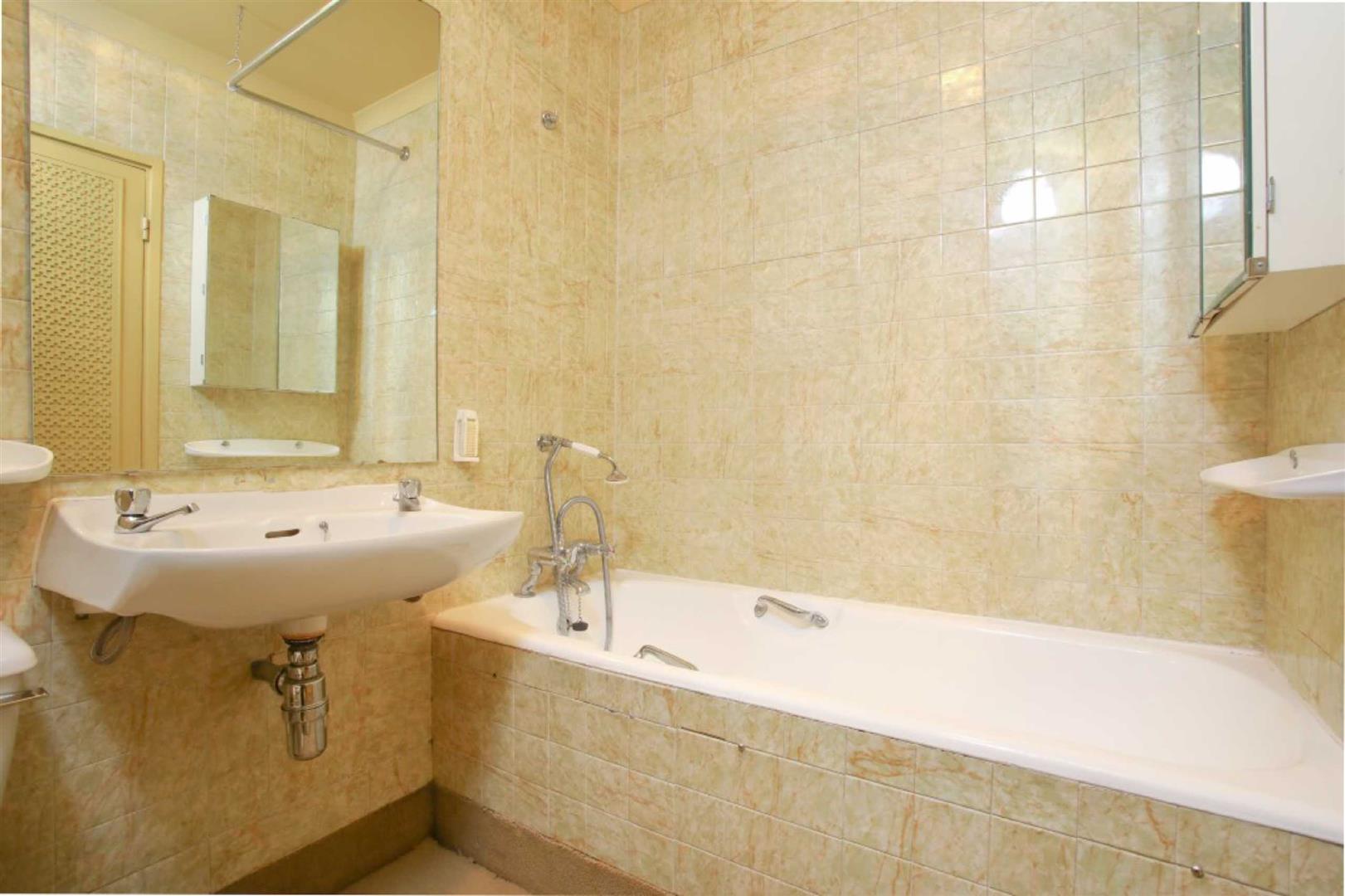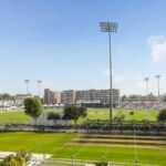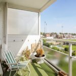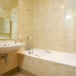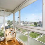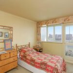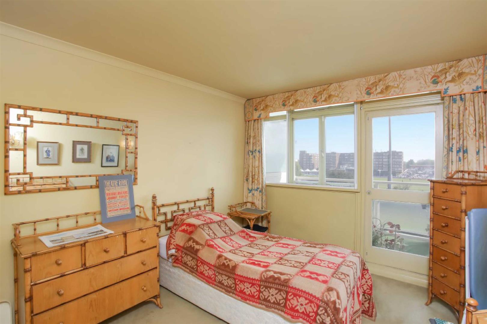 The double bedroom has fitted wardrobes and access out to the open balcony with views over the cricket ground in addition to a bathroom with a white suite.