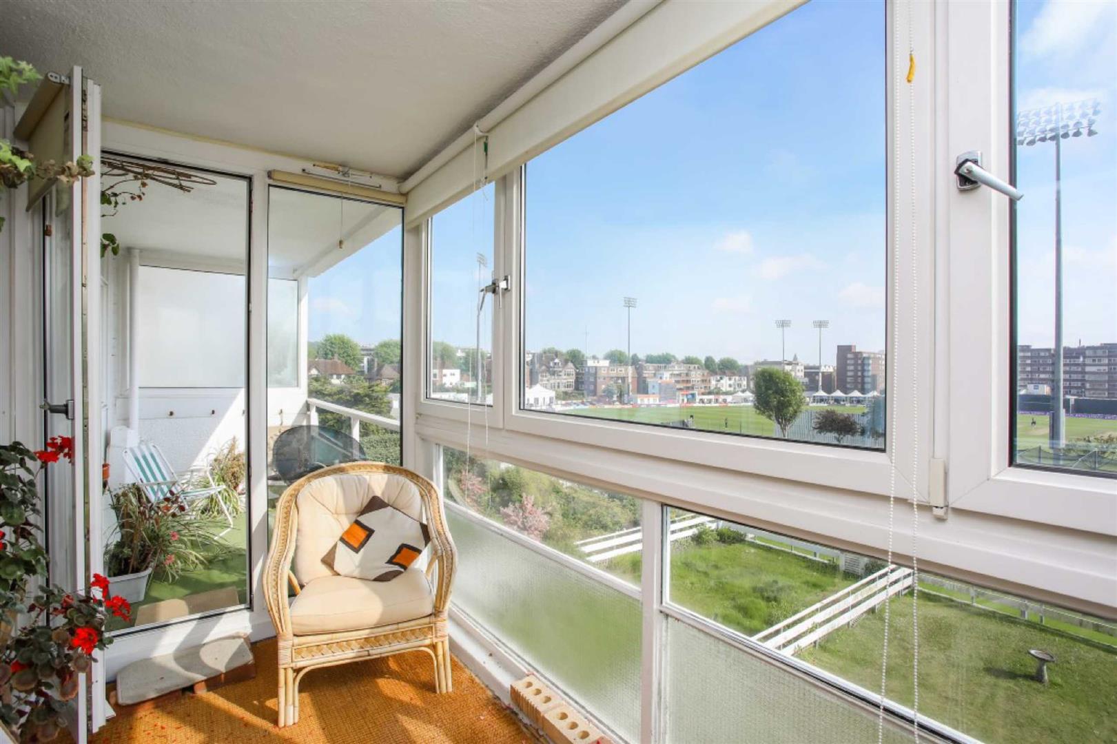 The front door opens into the entrance vestibule with cupboards and a further door leads into a spacious, L-shaped reception hall with entry phone system and storage cupboards, whilst a pair of glazed doors lead into the lounge. You are immediately drawn to the spectacular southerly view over the Sussex County Cricket Ground from an open balcony and sun room with double glazed tilt and turn windows.