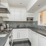 Adjacent to the lounge / dining room is a well-equipped kitchen with its range of high-gloss white fronted units with working services providing cupboard and drawer storage both above and below. Sink, inset four ring gas hob with the electric fan assisted below and extracted above with brushed steel backplate. Mosaic tiled walls, space for fridge and freezer integrated washing machine, shelf for microwave.