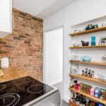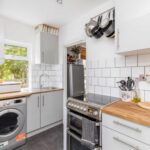 Kitchen with solid beech working surfaces with a cupboard and drawer storage above and below, standing space for cooker, inset stainless steel sink, mixer tap, space and plumbing for washing machine, tiled walls and floor with feature exposed natural brick wall, fitted shelving, wall mounted combination boiler, double glazed window to the side.