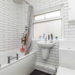 Bathroom; modern white suite comprising bath with fitted shower above, curtain and rail, semi-pedestal wash basin, low level wc, radiator, bevelled tiled walls, double glazed window to the side, extractor fan.