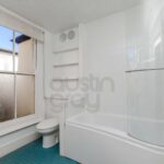 White suite comprising of shower bath with thermostatically controlled shower, glass shower screen, WC, washbasin and storage, towel radiator, pair of sash windows to the side.