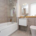 Bathroom/WC has a white suite with an enclosed bath, glass shower screen, WC, wash basin with illuminated cabinet above and storage beneath, window to the side, tiled walls.