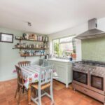 Sitting at the back of the house is kitchen/breakfast room with its range of freestanding units and an enamelled twin sink, standing space for appliances. Dual aspect with the window overlooking the rear garden whilst a glazed door and cat provides access out into the rear garden. Quarry tiled floor.