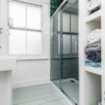 Shower Room. Large walk-in shower cubicle, pedestal wash hand basin, radiator, sash window to the rear and shelved storage.