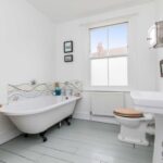 Bathroom. White suite comprises of a claw footed bath, low-level WC and pedestal wash hand basin, radiator, sash window to the rear. Utility cupboard with space and plumbing for washing machine.
