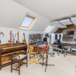 Returning to the first floor landing, a glazed door provides access out onto a wooden balustraded balcony whilst an industrial style staircase provides access up to an extensive attic space which has both the Velux windows to both front and rear elevations, power and lighting, radiators and access to eaves storage.