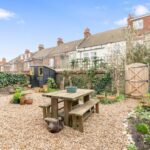 Rear garden being walled with flowering shrub borders with an array of shrubs, gated rear access leading around to neighbouring Julian Road, log store, bamboos and garden shed.