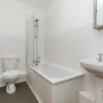 Bathroom/WC has a white suite with enclosed bath and mixer taps and shower attachment and glass shower screen, low-level WC, pedestal wash basin, partially tiled walls, heated towel rail and extractor fan.