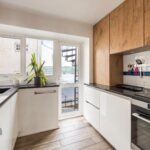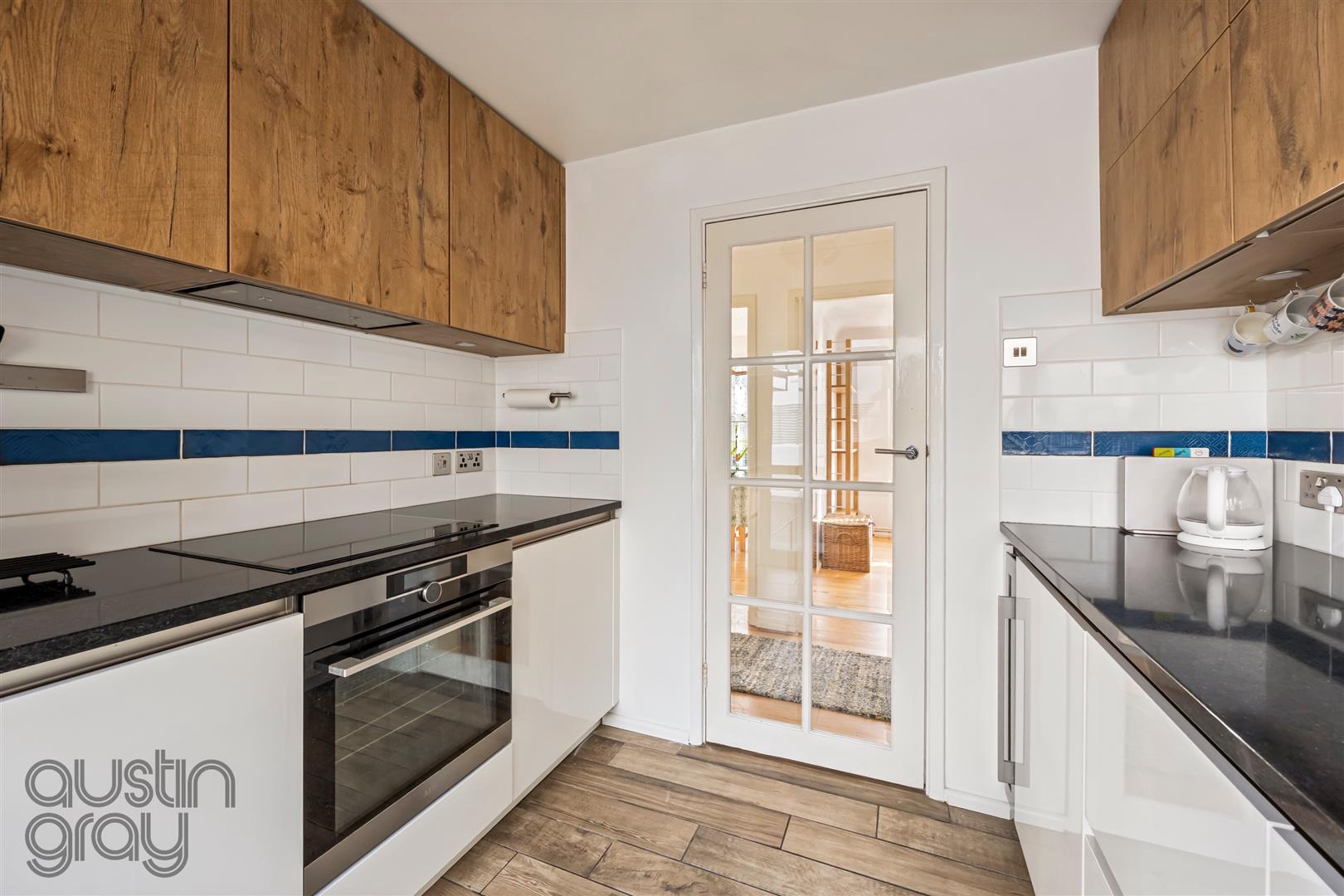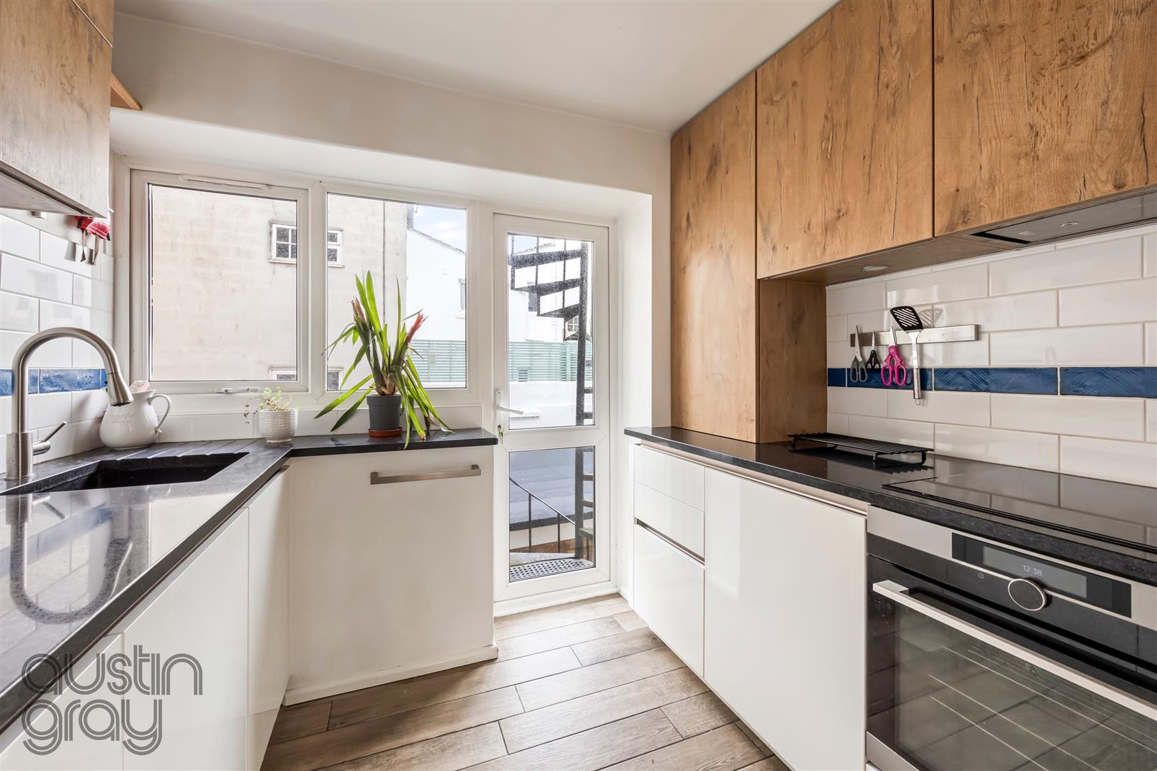 The separate, modern kitchen has been recently updated and includes fitted appliances, along with a gas combination boiler. Access out onto a spiral staircase descends to the ground floor and storeroom.