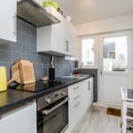The modern kitchen has a range of working services providing covenantal storage both and below, stainless steel single drainer sink, four ring hob with extractor above and fan assisted oven beneath Standing space for fridge, party tiled walls and UPVC double glazed window and door which overlooks allows access out into