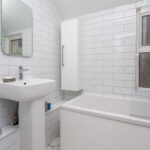 Bathroom/WC with modern white suite with bath and shower, glass shower screen, low-level WC, tiled floor, window to the side, towel radiator.