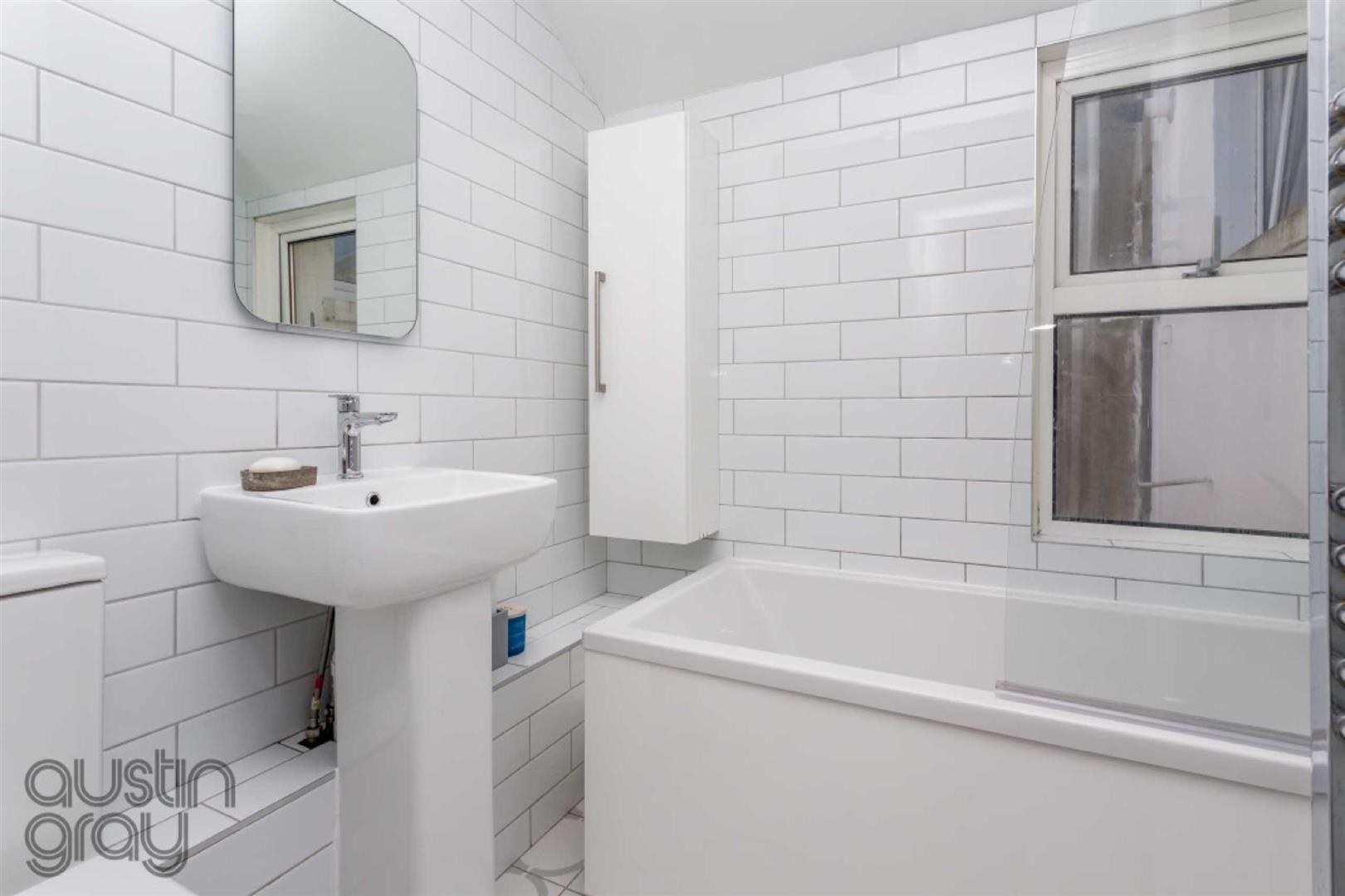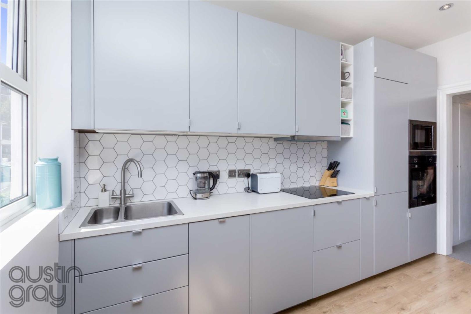 At the front of the flat is the open plan lounge/kitchen with a double glazed bay window to the front with the additional window to one side, the kitchen has recently been refitted with work surfaces providing cupboard and drawer storage both above and below, one and half bowl stainless steel sink, four ring induction hob, oven and microwave above, integrated fridge and freezer, and integrated washing machine.